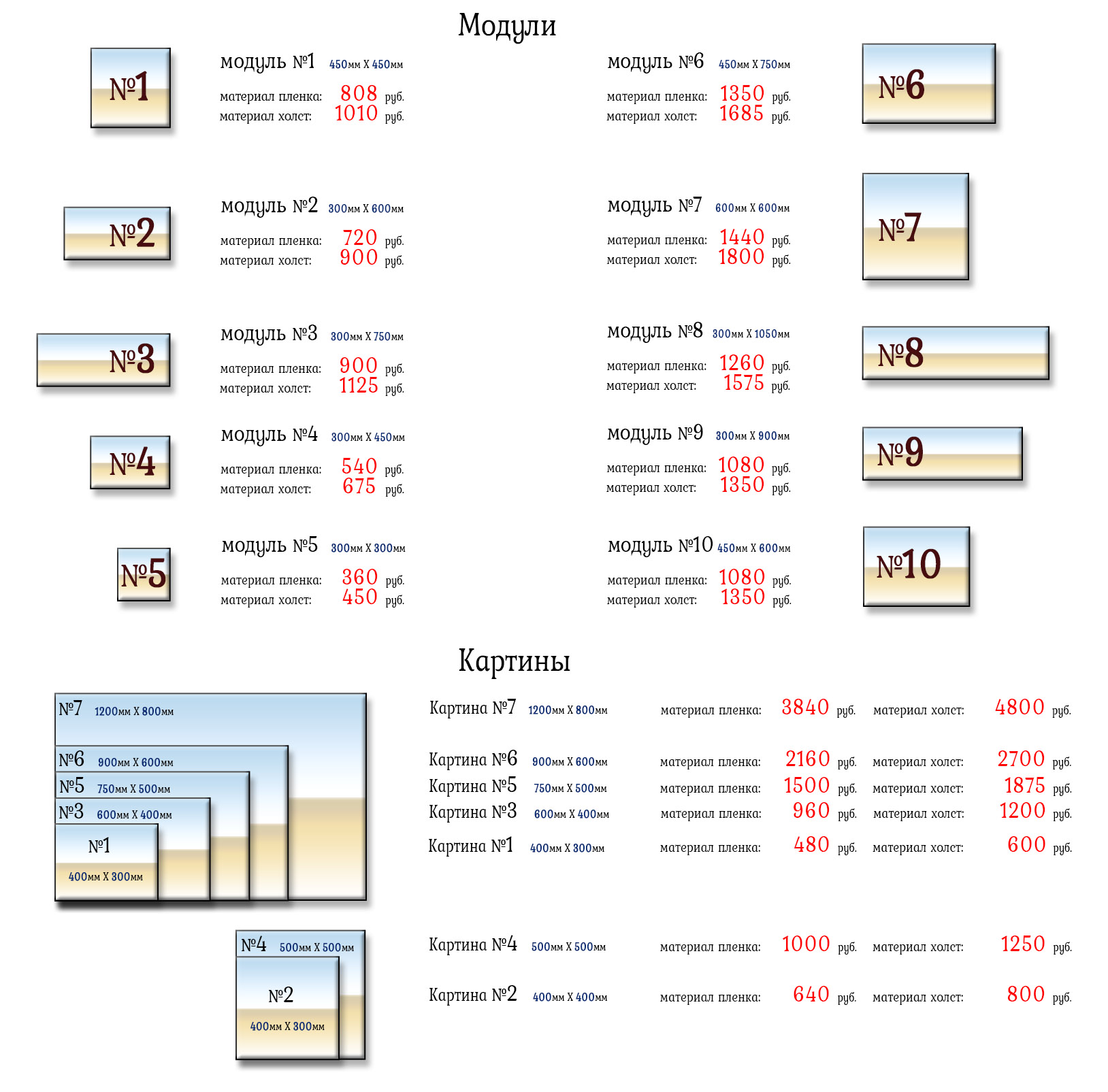 • Изображение для модульных картин принимаются от заказчика, затем создается макет и согласовывается перед печатью.